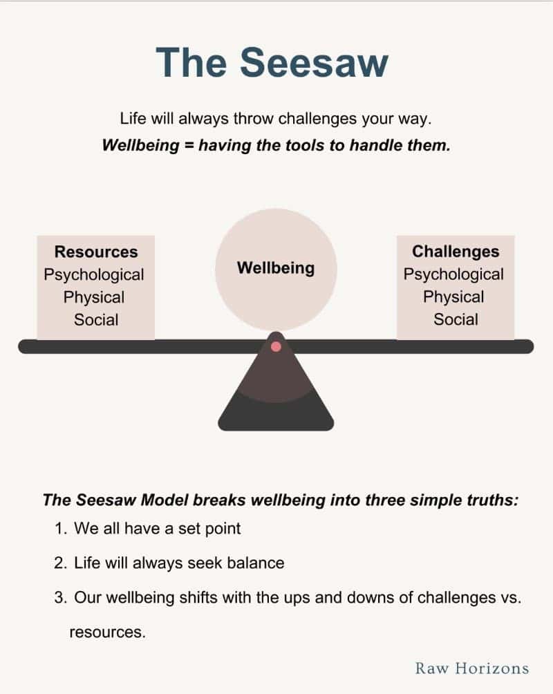 At Raw Horizons, we call it the Seesaw Model of wellbeing. It’s beautifully simple, yet it changes everything about how we approach mental and emotional health.